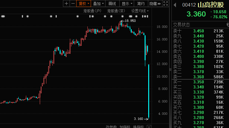 今日,港股山高控股再度暴跌76.02%。而就在此前的9月16日,该股曾经大幅下跌24.22%。本周内,公司股价从17港元一路跳水至最新的3.36港元,周跌幅高达80.27%。