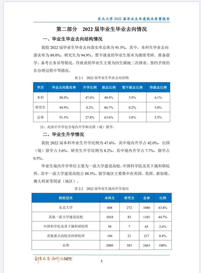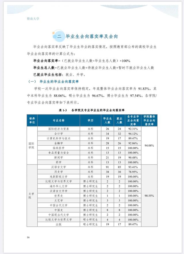 2022年毕业生总体下落率为91.83%,其中本科毕业生下落率为88.06%,硕士研究生下落率为96.67%,博士研究生下落率为97.54%。国内外本科毕业生深造率为43.3%。