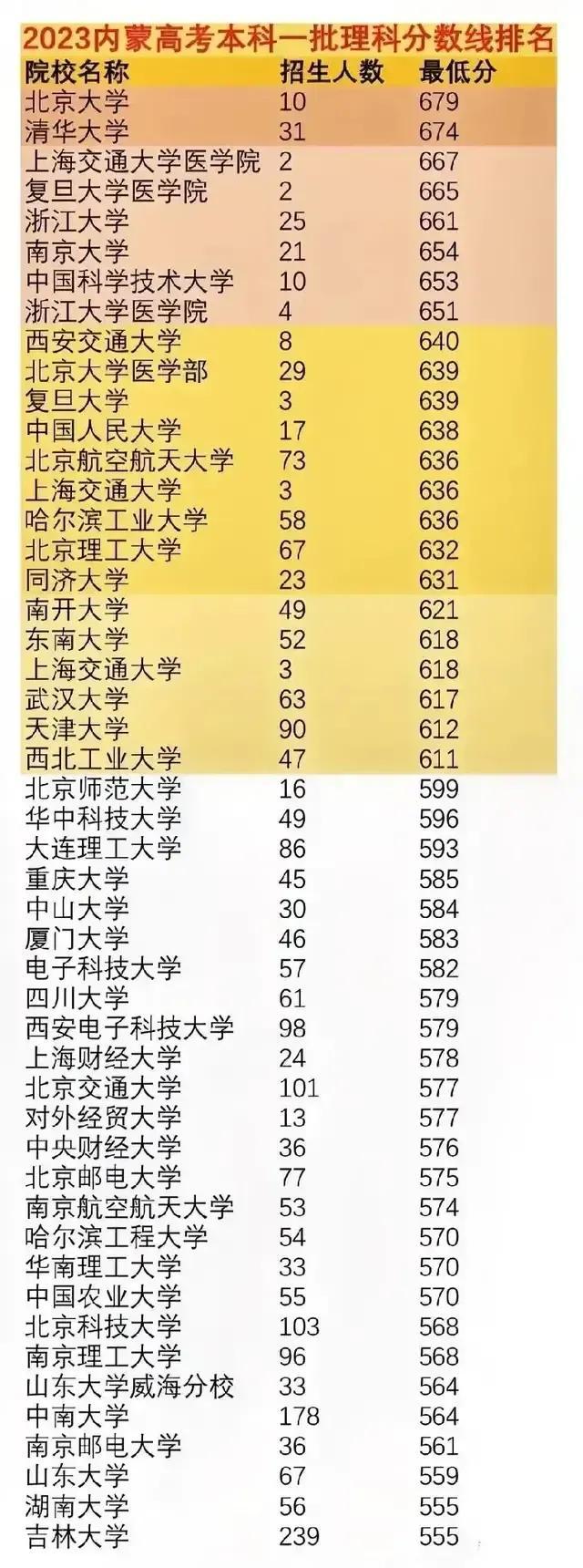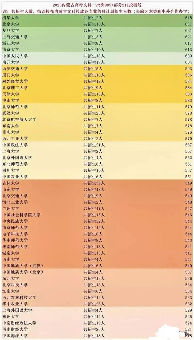 近日,内蒙古本科一批录取分数线出炉,文科一批录取分数线最高清华大学,备案分数线646。其次是北京大学,637分。复旦、上交、浙大、南大、人大、南开、西安交大、厦门大学依次排名前十。