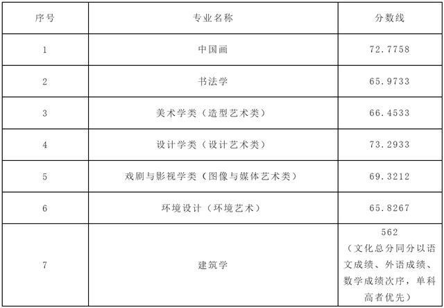 5、艺术学校考试专业综合排名平行时,专业复试成绩高者优先;专业复试成绩平行时,单科高者优先考虑语文成绩、外语成绩和数学成绩。建筑学专业在文化总分并列时,分别以语文成绩、外语成绩、数学成绩顺序为主,单科优先。
