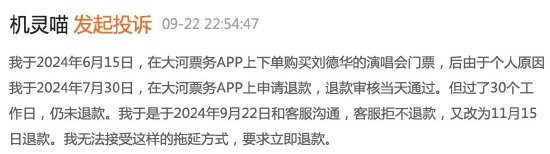 深圳的沈先生投诉称,6月15日,自己通过大河票务APP购买了两张刘德华的演唱会门票,共计花费5160元。后由于其个人原因,于7月30日在大河票务APP申请退款,退款审核当天通过,显示30个工作日内退款到账。