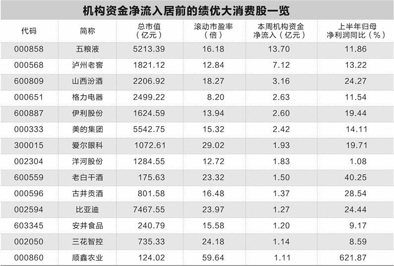 机构资金近期对低估值的消费股进行抄底。五粮液(000858)本周获得机构资金净流入13.7亿元。泸州老窖、山西汾酒(600809)、格力电器(000651)等个股的机构资金净流入额居前,其中格力电器的最新市盈率不足10倍。