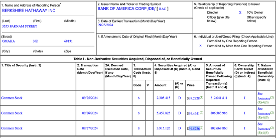 伯克希尔哈撒韦当地时间9月27日向美国证券交易委员会提交的文件显示,该公司于9月25日至27日共售出11678366股美国银行普通股,总价值约4.6亿美元。