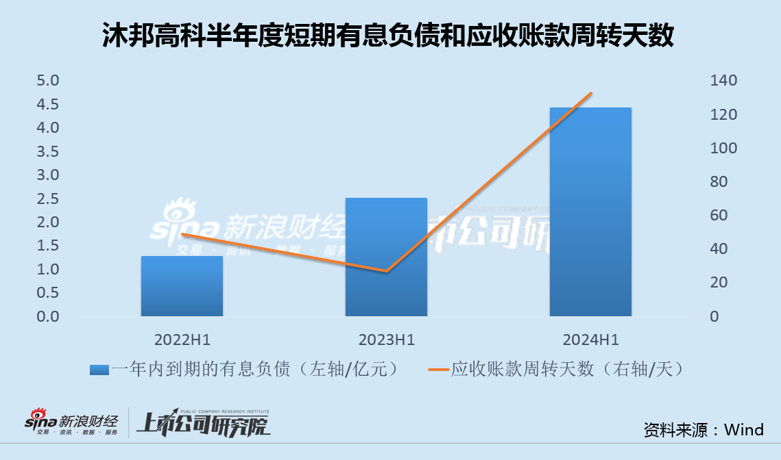 不过,公司资金紧张的状况并未得到根本改善。按上半年末的口径计算,自转型以来,沐邦高科短期借款和一年内到期的非流动负债逐年走高,应收账款周转天数也创下新高。
