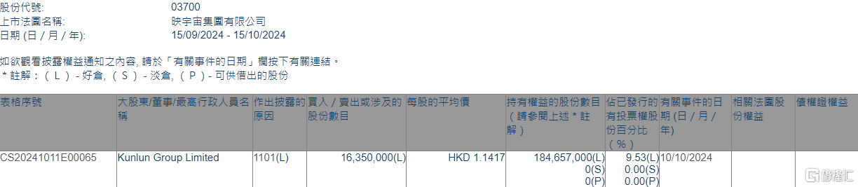 格隆汇10月15日丨根据联交所最新权益披露资料显示,2024年10月10日,映宇宙(03700.HK)获Kunlun Group Limited在场内以每股均价1.1417港元增持1635万股,涉资约1866.7万港元。