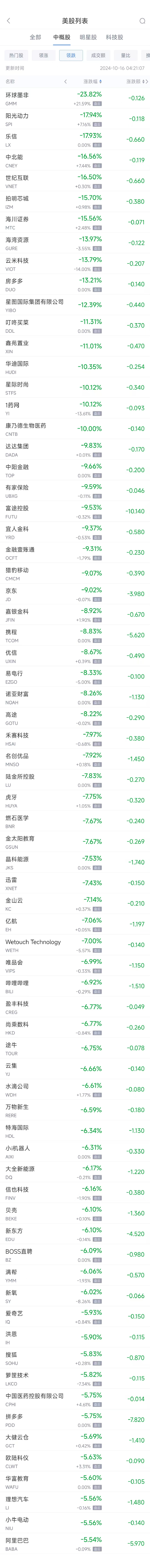 领跌中概股列表: