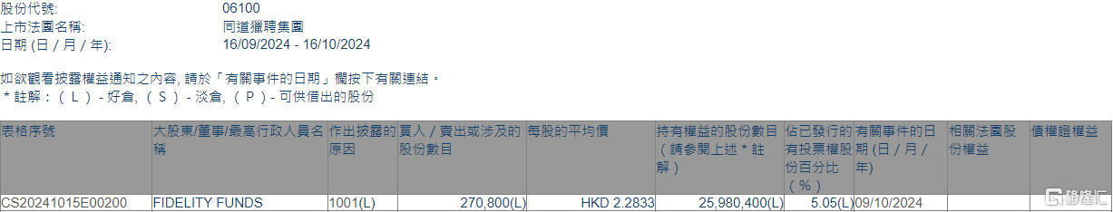 同道猎聘(06100.HK)获FIDELITY FUNDS增持27.08万股