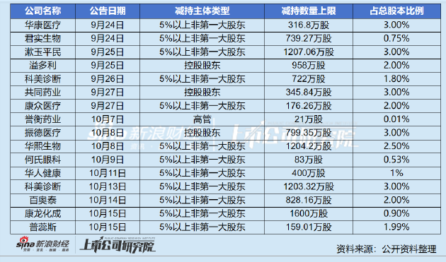 从减持比例看,华康医疗、漱玉平民、共同药业、振德医疗减持比例最高,均为3%;华熙生物减持比例为2.5%,排名第五;溢多利、康众医疗、普蕊斯减持比例为2%;科美诊断累计减持比例为4.8%。其中,共同药业、振德医疗、溢多利减持方为控股股东。