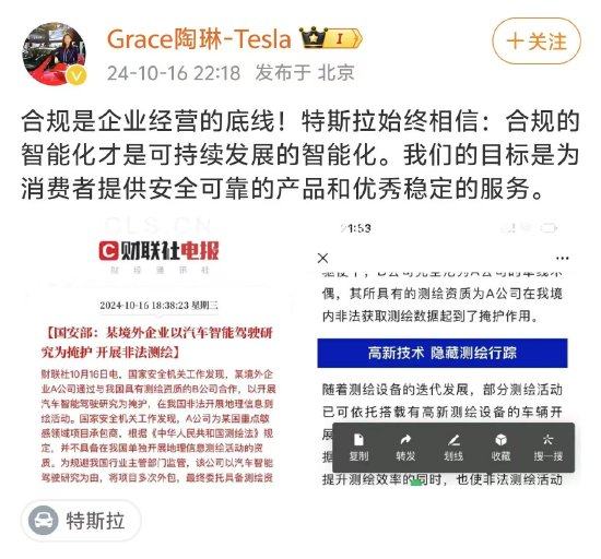 新浪科技讯 10月17日凌晨消息,近日,国安部发布消息称,某境外企业A公司通过与我国具有测绘资质的B公司合作,以开展汽车智能驾驶研究为掩护,在我国非法开展地理信息测绘活动。对此,特斯拉对外事务副总裁陶琳发布微博表示,合规是企业经营的底线!