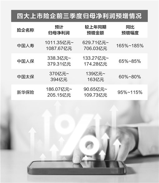 从三季报业绩预增的4家上市险企来看,中国人保、中国太保的预增幅度均超60%,中国人寿、新华保险的预增幅度则超过或接近100%。