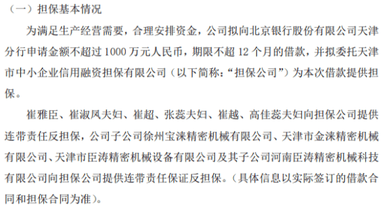 崔雅臣、崔淑凤夫妇、崔超、张蕊夫妇、崔越、高佳蕊夫妇向担保公司提供连带责任反担保,公司子公司徐州宝涞精密机械有限公司、天津市金涞精密机械有限公司、天津市臣涛精密机械设备有限公司及其子公司河南臣涛精密机械科技有限公司向担保公司提供连带责任保证反担保。(具体信息以实际签订的借款合同和担保合同为准)。