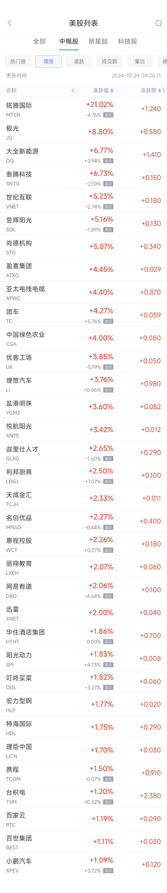 上涨股当中(按市值降序排列),台积电涨1.20%,携程涨1.50%,理想汽车涨3.76%,百济神州涨0.17%,华住酒店集团涨1.86%,小鹏汽车涨1.09%,唯品会涨0.93%,名创优品涨2.27%。
