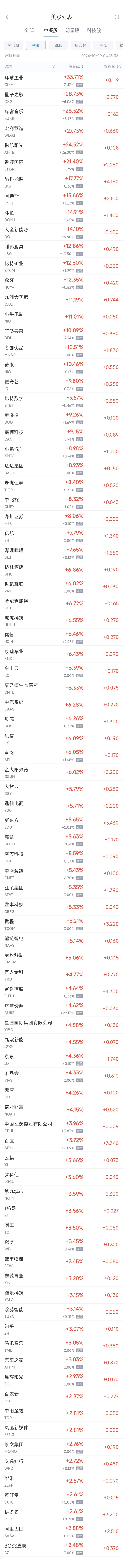 上涨股当中(按市值降序排列),阿里巴巴涨2.60%,拼多多涨2.71%,京东涨4.36%,网易涨1.67%,携程涨5.21%,百度涨3.72%,理想汽车涨1.18%,中华电信涨0.22%,贝壳涨6.21%,百济神州涨2.07%,腾讯音乐涨3.13%,中通涨1.07%,富途控股涨4.64%,华住酒店集团涨2.06%,蔚来涨10.46%,小鹏汽车涨8.94%,新东方涨5.65%,满帮涨2.06%,哔哩哔哩涨7.65%,唯品会涨4.36%,极氪涨0.71%,BOSS直聘涨2.48%,名创优品涨10.45%,360数科涨0.46%。