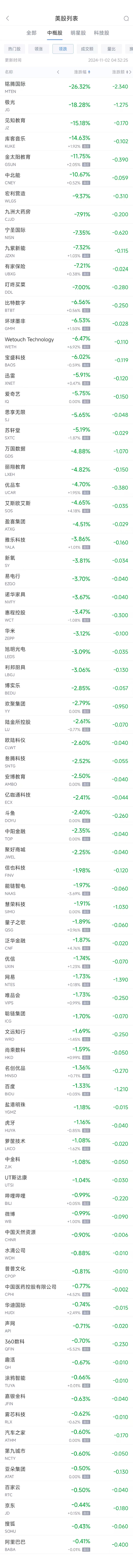 下跌股当中(按市值降序排列),阿里巴巴跌0.41%,拼多多跌0.02%,京东跌0.44%,网易跌1.73%,百度跌1.33%,腾讯音乐跌0.09%,中通跌0.09%,满帮跌0.11%,哔哩哔哩跌0.99%,唯品会跌1.73%,WSP控股跌0.34%,名创优品跌1.36%,360数科跌0.70%,万国数据跌4.88%,文远知行跌1.69%,亚朵集团跌0.50%,汽车之家跌0.60%。