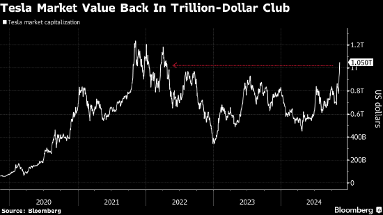 特斯拉市值重返1万亿美元 特朗普胜选以来股价飙升30%