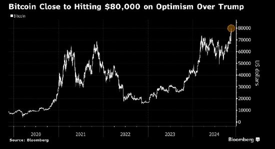 比特币首次逼近80,000美元 市场对特朗普充满期待
