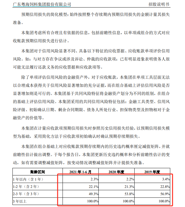 根据招股说明书,“于每个报告日,本集团更新历史违约概率和分析前瞻性估计的变动”,但粤海饲料上市后各期财务报告均未披露应收账款减值矩阵变动情况。