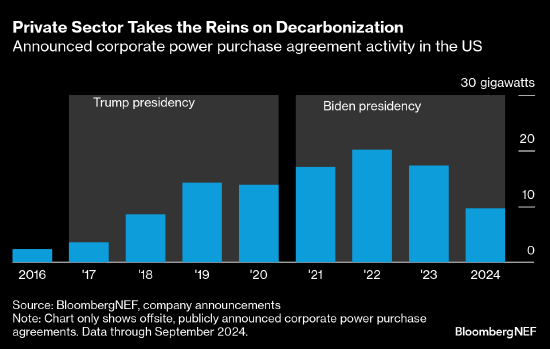 面对联邦政府的冷漠态度,私营部门历来的做法都是提高气候雄心。企业购买清洁能源就是一个范例。在特朗普首个总统任期内,美国企业购电协议(PPA)规模年均增长63%,将一个新兴市场变成了成熟市场。然而,乔·拜登执政期间,尽管签订协议流程简化且清洁能源行业得到更多支持,PPA市场仅增长9%。