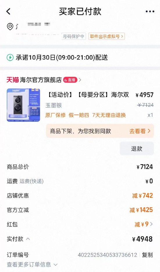 “我8月份买的时候是淡季有活动,他们可能是觉得我买便宜了,这双十一还有国补,就要求我退款,还说退款对我来说更合适。但是我的柜子是按照这个洗衣机尺寸留的,必须要求立刻发货”,李先生气愤道。