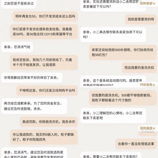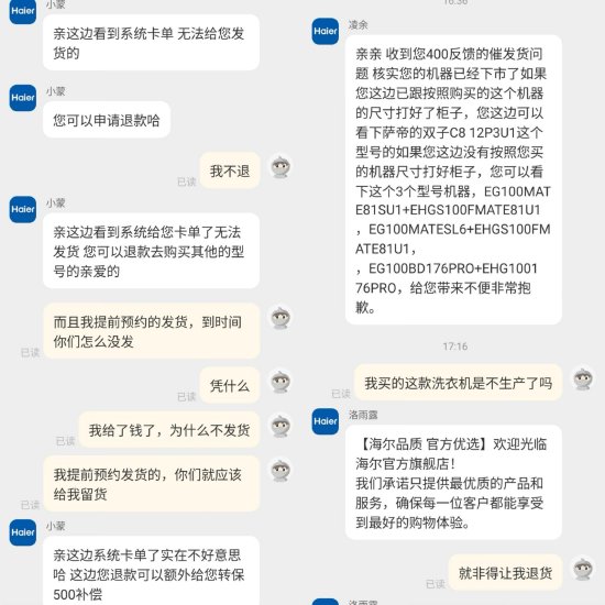但是,直到11月13日洗衣机还未发货。李先生沟通后,旗舰店客服称系统卡单了无法发货,此款洗衣机已经下市,建议李先生申请退款,并可额外赔偿500元。在其反复追问下,客服又称李先生可重新拍相同尺寸的卡萨帝洗衣机,这样柜子就可以用了。