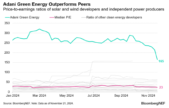 该公司在多项财务指标上的表现都优于其他光伏和风电开发商。11月11日,该公司的市盈率为165倍,与彭博新能源财经分析的56家行业公司的中位数23倍相比,是一个极端离群值。这一差距可视作Adani Green Energy估值过高的一个指标,尽管也可能反映了投资者对其雄心勃勃的增长目标的认同。