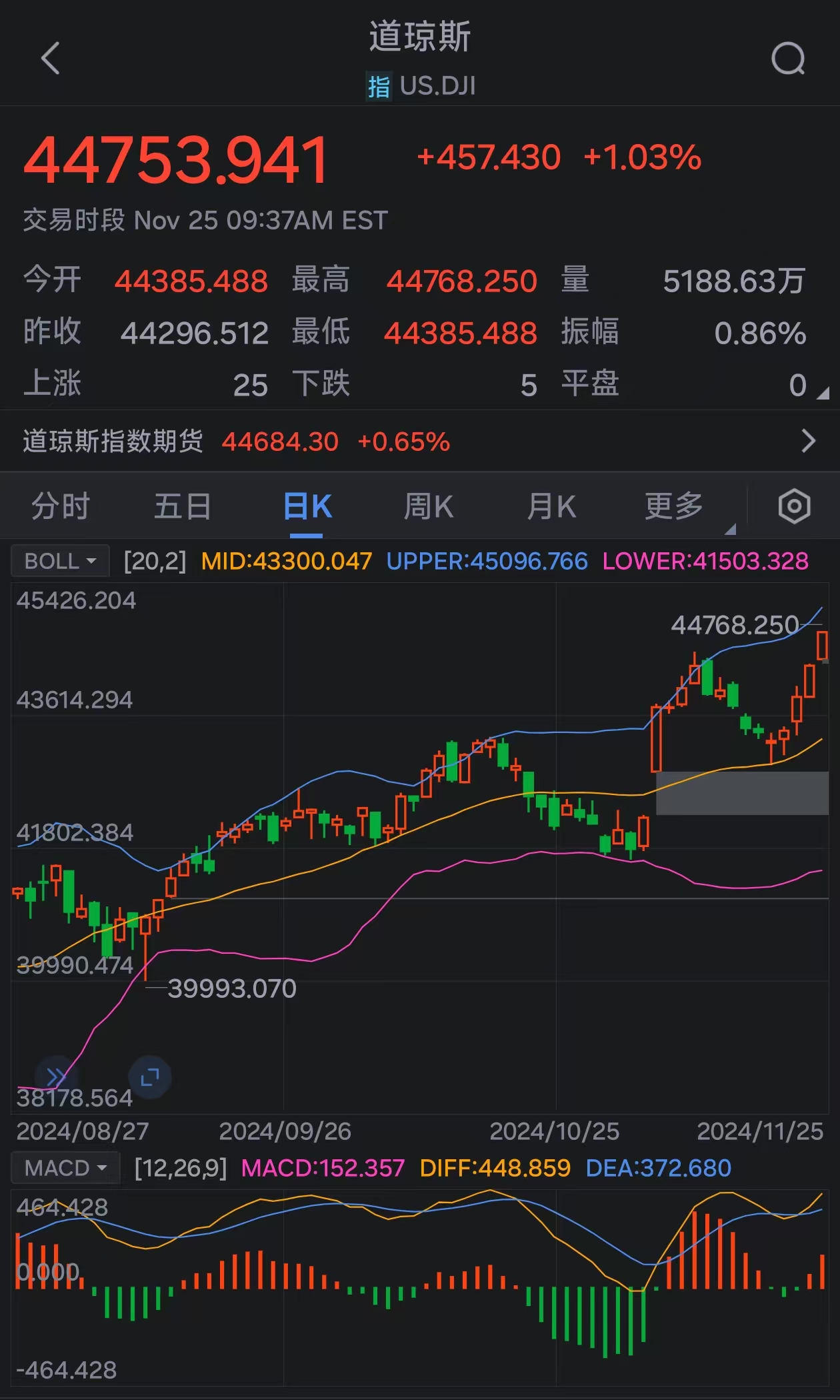 道指快速拉升涨超1%,盘初刷新历史新高至44759.08点。纳斯达克综合指数开盘上涨142.4点,涨幅0.75%。