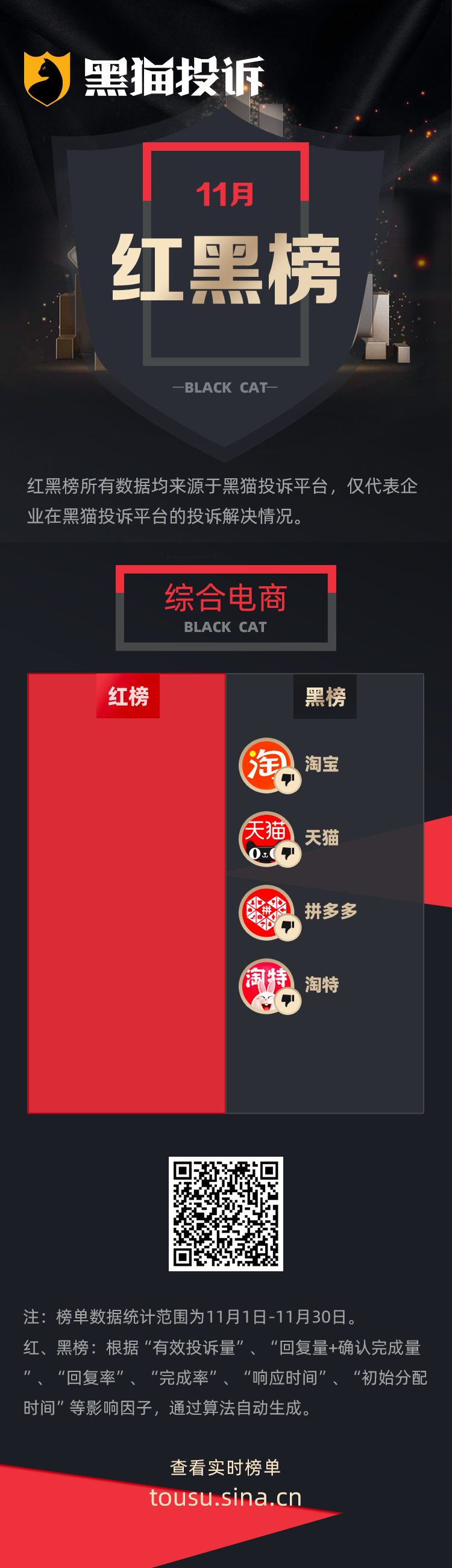 黑猫投诉 【下载黑猫投诉客户端】发布11月企业投诉处理红黑榜单,数据均来源于黑猫投诉平台,反映了企业在黑猫投诉平台的投诉处理解决情况。