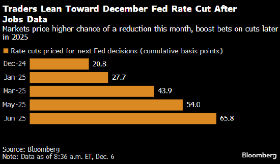 数据显示11月份新增非农就业人数和失业率都上升之后,对央行政策最敏感的2年期国债收益率周五下跌4个基点至4.10%。市场定价隐含美联储12月会议降息大约21个基点,数据公布前大约16个基点。