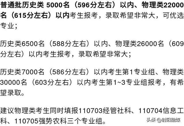 建议历史类21500名(541分左右)以上考生积极报考,录取概率较大;根据物理分组的不同,建议“物理” 专业组75000人(552分及以上),“物理 “物理”专业组85000人(542分及以上) 专业组7.9万名(548分及以上)考生积极报考,录取概率高。建议中外合作办学1万人(527分以上),欢迎广大考生积极报考。