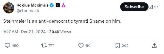 马斯克是针对施泰因迈尔在解散德国联邦议院的演讲中反对外部影响的言论发表这一评论的,也是在回应支持德国极右翼政党选择党(AfD)的19岁网红少女奥米·塞布特(Naomi Seibt)发表的一篇批评施泰因迈尔的帖子。