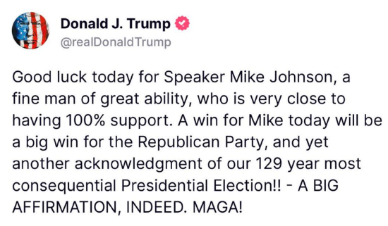 美国当选总统唐纳德·特朗普在Truth Social发帖称:“祝众议长迈克·约翰逊今天好运,他是个能力出众的好人,非常接近获得100%的支持。”