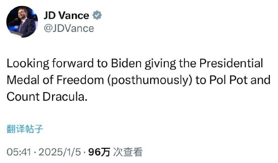 万斯在 X(原推特)上发文称:“期待拜登(追授)把总统自由勋章颁发给波尔布特和德古拉伯爵呢。” 言辞犀利地嘲讽拜登的授勋选择,将部分获勋者与负面形象类比,暗指拜登政治偏向。