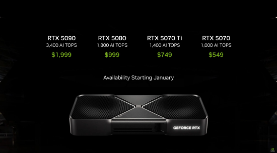 除了RTX 5070,黄仁勋还发布了RTX 5070 Ti(749美元)、RTX 5080(999美元),以及顶级型号RTX 5090(1999美元)。采用RTX Blackwell GPU的笔记本电脑,电池寿命有望延长40%,性能提高一倍,而功耗减半,价格从1299美元到2899美元不等。