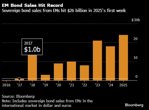 新兴经济体的主权债券发行创下了最繁忙的开年纪录,各国政府争相在唐纳德·特朗普宣誓就任美国总统之前锁定资金。