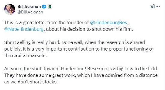 阿克曼在他的帖子中写道:“兴登堡研究所的关闭是该领域的重大损失。他们做了一些很棒的工作,我从远处欣赏他们,因为我们不做空股票。”