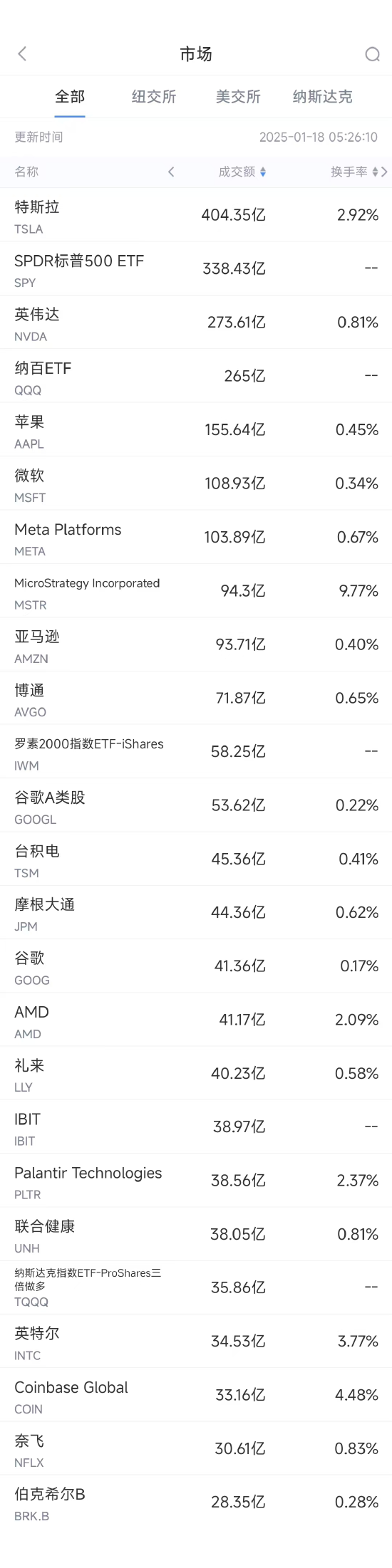 1月17日美股成交额前20:据传英特尔成为收购目标
