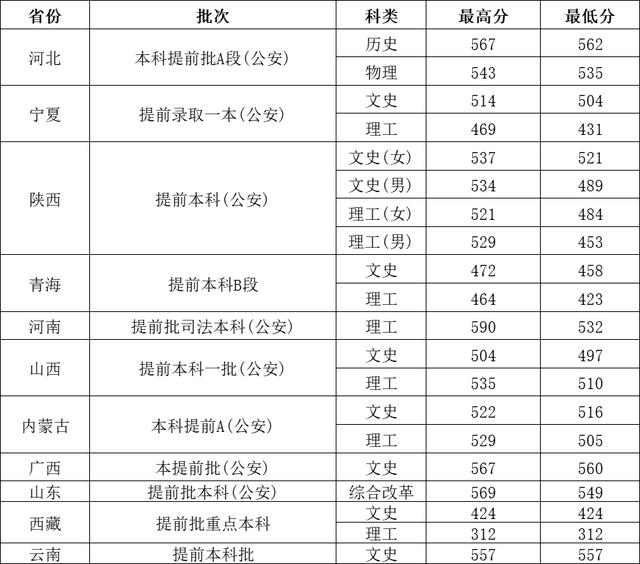 陕西文史类(女)本科提前批(公安类)最高分537分,最低分521分,文史类(男)最高分534分,最低分489分。