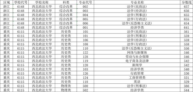 重庆本科批历史分数较高的专业:法学(民商法)561分,法学(刑法)559分,法学(经济法)559分,法学(行政法)558分,最低英语529分。物理专业备案分数线:法律(刑法)566分,经济学544分。