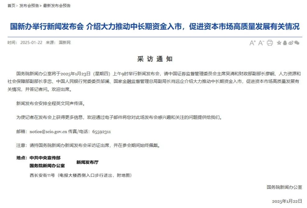 据国新办官网发布,国务院新闻办公室将于2025年1月23日(星期四)上午9时举行新闻发布会,请中国证券监督管理委员会主席吴清和财政部副部长廖岷、人力资源和社会保障部副部长李忠、中国人民银行党委委员邹澜、国家金融监督管理总局副局长肖远企介绍大力推动中长期资金入市,促进资本市场高质量发展有关情况,并答记者问。