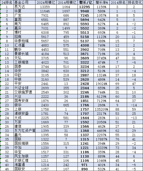 近日,基金公司2024规模排名出炉,与十年前的2014年末排名相比,基金行业发生了较大变化。