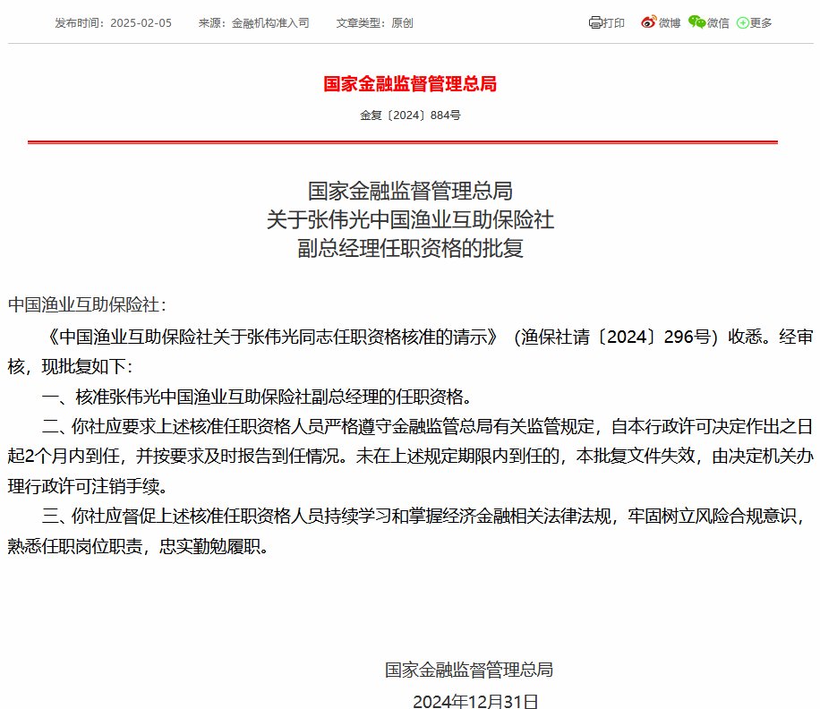 张伟光中国渔业互助保险社副总经理任职资格获核准