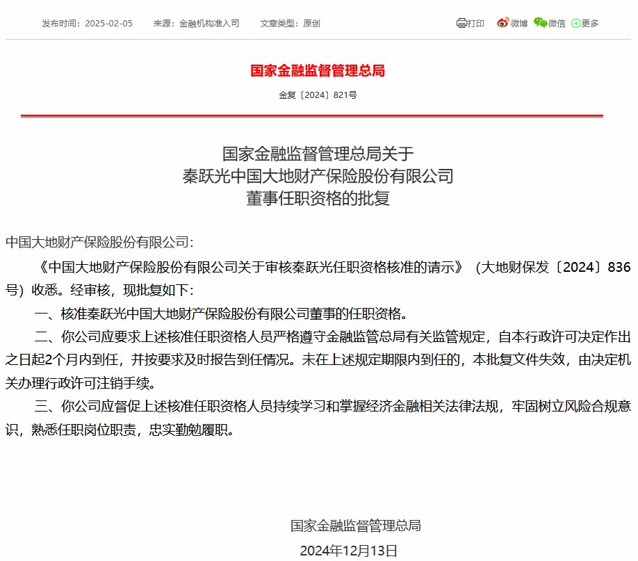 2月5日金融一线消息,国家金融监督管理总局今日发布关于秦跃光中国大地财产保险股份有限公司董事任职资格的批复,核准秦跃光中国大地财产保险股份有限公司董事的任职资格。