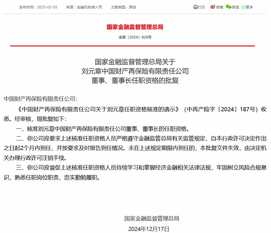 2月5日金融一线消息,国家金融监督管理总局今日发布关于刘元章中国财产再保险有限责任公司董事、董事长任职资格的批复,核准刘元章中国财产再保险有限责任公司董事、董事长的任职资格。