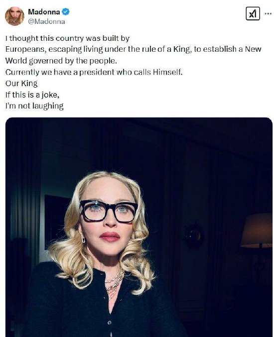 美国知名歌手麦当娜21日在X上发贴抨击特朗普:“我以为这个国家是由欧洲人建立的,为了逃避国王统治,建立了一个由人民治理的新世界。现在,我们的总统自称为我们的国王。如果这是个笑话,我笑不出来。”