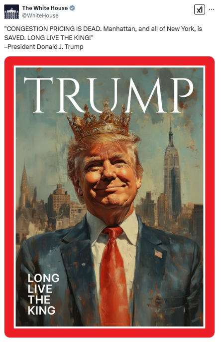 此前,特朗普政府于周三宣布叫停纽约市有争议的拥堵收费计划,白宫在X上的官方账号随后发帖称:““拥堵收费已死。曼哈顿和整个纽约都得救了。国王万岁!”并配了一张特朗普头戴王冠的图片。