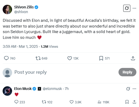 马斯克随后确认该消息,这也是马斯克第14个孩子。