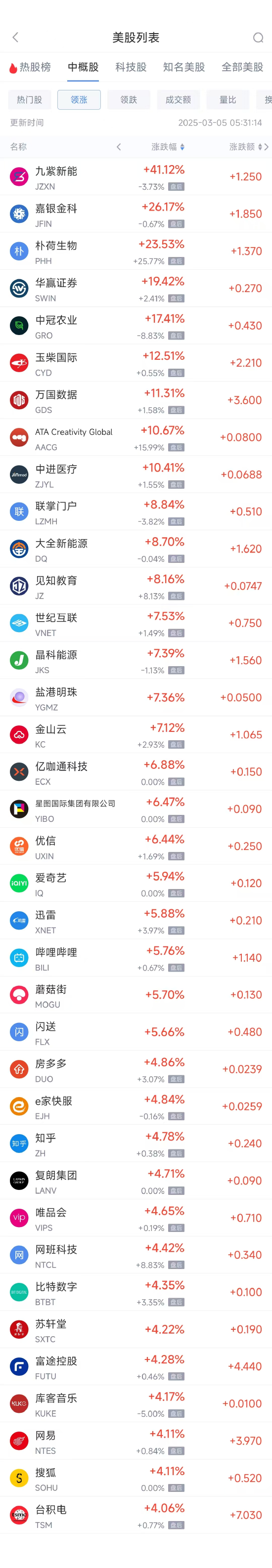 领涨中概股列表:
