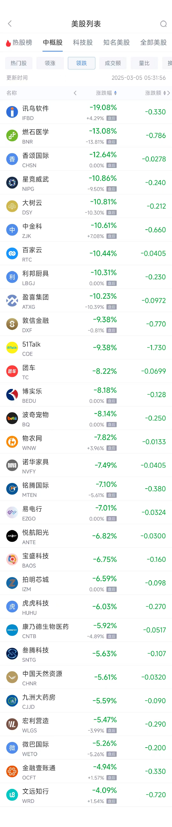 领跌中概股列表: