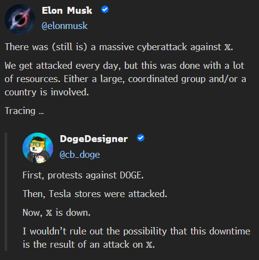 埃隆·马斯克将旗下社交媒体平台X的大范围中断归咎于“大规模网络攻击”,他推测这是由一个“大型、有组织的团体”或国家策划。