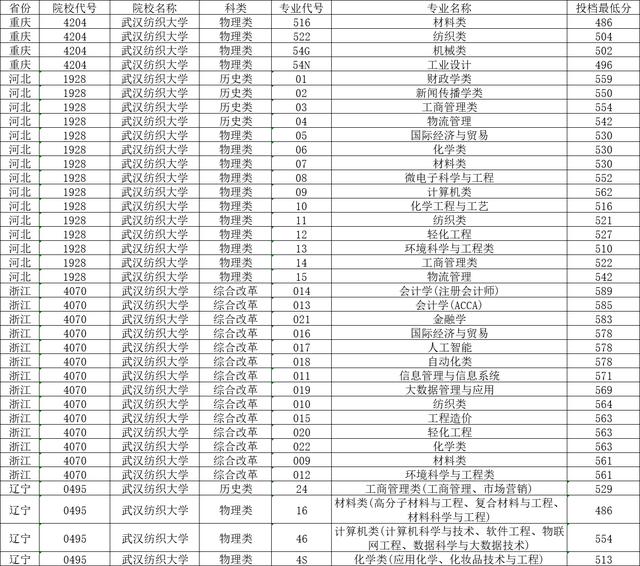 2023年,武汉纺织大学在重庆,河北、辽宁、浙江 各专业备案分数线